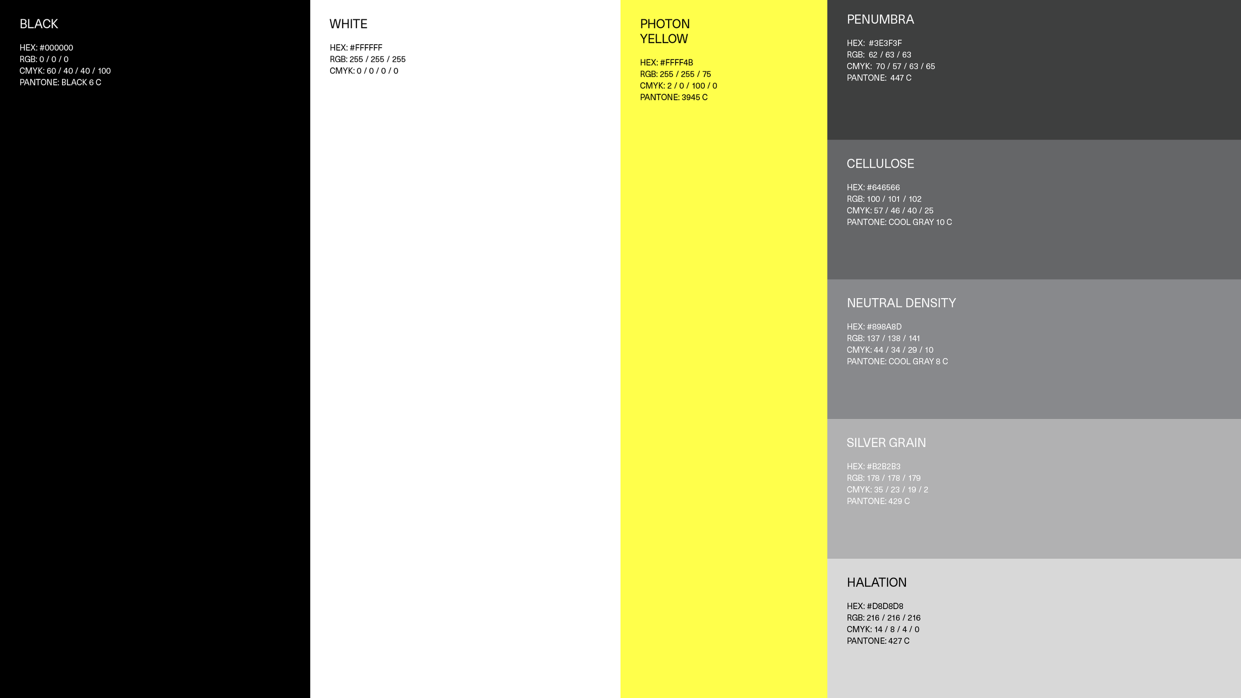 As our goal was to illustrate light emerging from darkness, I chose black and white as our primary brand colors. Pure white light emerging from pure black darkness. A vibrant yellow serves as secondary color, evoking warmth. Shades of gray round out the color palette.